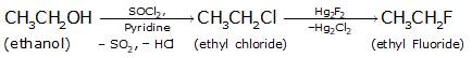Ethanol in treatment with thionyl chloride(SOCl2) in the presence of pyridine gives ethyl chloride with the evolution of SO2 gas. The ethyl chloride on treatment with mercury fluoride gives ethyl fluoride (the Cl of ethyl chloride is being replaced by F from Hg2F2).