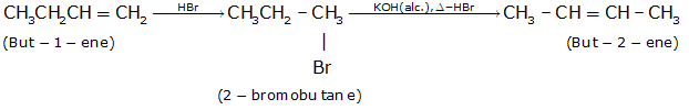 But-1-ene reacts with HBr to form 2-bromobutane(acc. To markovnikoff’s rule) and further 2-bromobutane is treated with alcoholic KOH in the presence of heat to form But-2-ene with the removal of HBr.(alcoholic KOH removes H from the carbon which has less number of hydrogens just next to the carbon to which halide is attached and gives the major product i.e. Saytzeff rule)