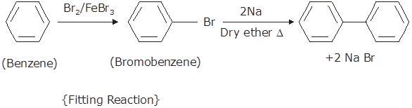 Firstly, the benzene is treated with Br2/FeBr3 results in the formation of bromobenzene. It is an electrophilic substitution. Further the bromobenzene is treated with Na metal in presence of dry ether to form biphenyl as the final product and NaBr as the by-product.