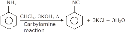 Aniline on reaction with trichloride alkyl group and KOH forms isophenylcyanide. It is electrophillic addition reaction in which an electron deficient group attaches to benzene ring at ortho or para.