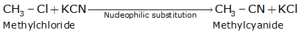 When methyl chloride is treated with KCN, it undergoes a substitution reaction to give methyl cyanide.