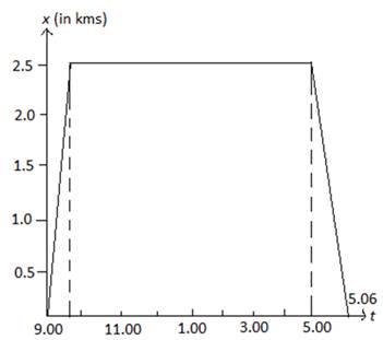 A woman starts from her home at 9.00 am, walks with a speed of 5 km/hon a straight road up to her office 2.5 km away, stays at the office up to 5.00 pm, and returns home by an auto with a speed of 25 km/h. Choose suitable scales and plot the x-t graph of her motion.