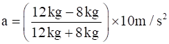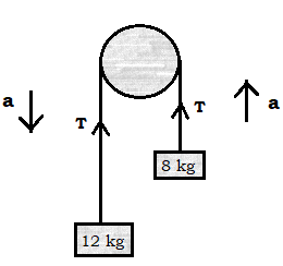 Two masses 8 kg and 12 kg are connected at the two ends of a light inextensible string that goes over a frictionless pulley. Find the acceleration of the masses, and the tension in the string when the masses are released.