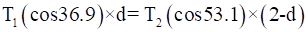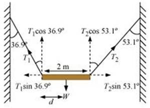 A non-uniform bar of weight W is suspended at rest by two strings of negligible weight as shown in Fig.7.39. The angles made by the strings with the vertical are 36.9° and 53.1° respectively. The bar is 2 m long. Calculate the distance d of the centre of gravity of the bar from its left end.