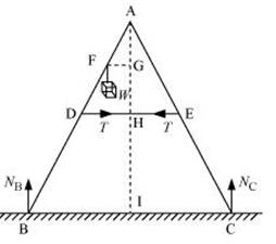 As shown in Fig.7.40, the two sides of a step ladder BA and CA are 1.6 m long and hinged at A. A rope DE, 0.5 m is tied half way up. A weight 40 kg is suspended from a point F, 1.2 m from B along the ladder BA. Assuming the floor to be frictionless and neglecting the weight of the ladder, find the tension in the rope and forces exerted by the floor on the ladder. (Take g = 9.8 m/s2)