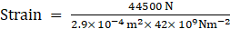 A piece of copper having a rectangular cross-section of 15.2 mm × 19.1 mm is pulled in tension with 44,500 N force, producing only elastic deformation. Calculate the resulting strain?