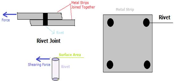 Now here the metal strips are riveted together so the stress in the rivet would be shearing stress since force would be perpendicular to surface area of rivet and stress is the restoring force per unit area, restoring force is same as applied force in equilibrium condition, the rivet joints and force on them are as shown in the figure