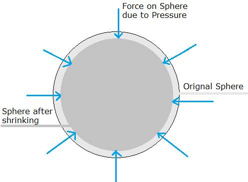 Here the solid Steel Ball placed in the water under high pressure is compressed uniformly at all Points. The force applied by the water acts in a perpendicular direction at each point on the surface of sphere This leads to decrease in its volume. The body develops internal restoring forces that are equal and opposite to the forces applied to it by water. The internal restoring force per unit is known as hydraulic stress and in magnitude is equal to the hydraulic pressure, since stress is restoring force per unit area. The strain produced by the pressure is called volume strain and is defined as the ratio of change in volume to the original volume. Since the strain is a ratio of change in dimension to the original dimension