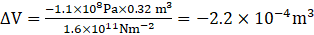 Minus sign suggest that volume has decreased as compared to original So we get change in volume of sphere is 2.2 × 10-4 m3