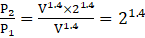 A cylinder with a movable piston contains 3 moles of hydrogen at standard temperature and pressure. The walls of the cylinder are made of a heat insulator, and the piston is insulated by having a pile of sand on it. By what factor does the pressure of the gas increase if the gas is compressed to half its original volume?