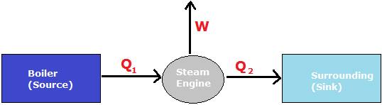 The steam engine absorbs energy in form of heat from boiler and converts some of it into mechanical work and return rest to the surrounding or we can say some part of heat absorbed is converted into work and rest is wasted, suppose Q1 heat is absorbed from Boiler (Source), W amount of work is done by the engine and Q2 heat is returned to the surroundings (Sink)