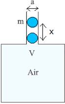Here we are given av air chamber of volume V having a neck area of cross section a into which a ball of mass m just fits and can move up and down without any friction, suppose the ball is pushed down a bit, so the volume area of chamber decreases a bit, and hence pressure inside the chamber increases hence pressure on ball increases and pushes it in opposite direction, and since pressure variation is isothermal the product of pressure and volume will always be constant, also the force on ball will depend on its displacement from original position or mean position, so ball will start oscillating in an simple harmonic motion around the mean position, now let the ball be pushed downward by a distance x,