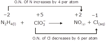Hence, we can infer easily that the oxidation number of N increases from – 2 in N2H4 to + 2 in NO and the oxidation number of Cl decreases from + 5 in ClO3- to – 1 in Cl– . Hence, in this reaction N2H4 is the reducing agent and ClO3- is the oxidizing agent.