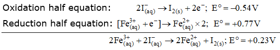E° for the overall reaction is positive. Thus, the reaction between Fe3+(aq) and I(aq) is feasible.