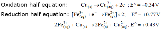 E° for the overall reaction is positive. Thus, the reaction between Fe3+(aq) and Cu(s) is feasible.