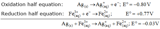 E° for the overall reaction is negative. Thus, the reaction between Ag(s) and Fe3+(aq) is not feasible.