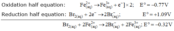 E° for the overall reaction is negative. Thus, the reaction between Br2(aq) and Fe2+(aq) is not feasible.