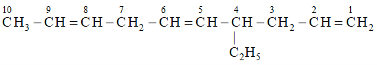 The parent chain in this compound is an alkene with a double bond between 5th and 6th, 8th and 9th carbon and an ethyl substitution at 4th carbon. Hence, the name of the compound is- 4-Ethyldeca-1, 5, 8-triene. The numbering is done as follows : -