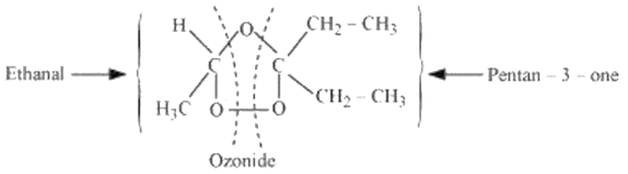 Now, we know that during the process of ozonolysis, an ozonide having a cyclic structure is formed as an intermediate which undergoes cleavage to give the final products. Ethanal and pentan-3-one are obtained from the intermediate ozonide. Hence, the expected structure of the ozonide could be:-