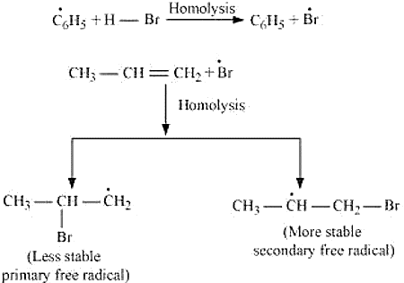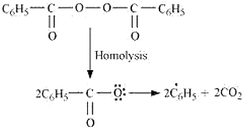 In the presence of benzoyl peroxide, an addition reaction takes place anti to Markovnikov’s rule. The reaction follows a free radical chain mechanism as: