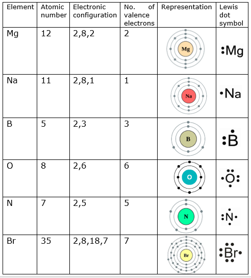 Write Lewis dot symbols for atoms of the following elements: Mg, Na, B, O, N, Br.