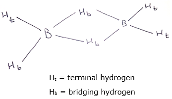 2 boron and 4 terminal hydrogen atoms (Ht) lie in one plane, while the other two bridging hydrogen atoms (Hb) lie in a plane perpendicular to the plane of boron atoms. Again, of the two bridging hydrogen atoms, one H atom lies above the plane and the other lies below the plane. The terminal bonds are regular two-center two-electron (2c – 2e– ) bonds, while the two bridging (B–H–B) bonds are three-center two-electron (3c – 2e– ) bonds.