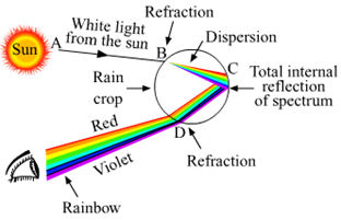 Refraction, dispersion and internal reflection of sunlight are three phenomenon of light involved in formation of rainbow. It is formed due to dispersion of sunlight through water droplets. Water droplets act as small prism through which sunlight enters it refracts and disperses and then gets reflected internally which creates a rainbow in the sky which is seen to observer’s eye.