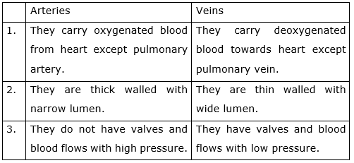 List three differences between arteries and veins.