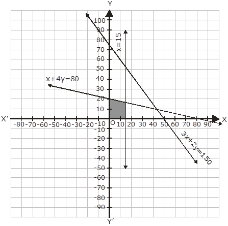 3x + 2y ≤ 150, x + 4y ≤ 80, x ≤ 15, y ≥ 0, x ≥ 0
