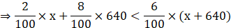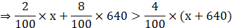 ∴ 2% of x + 8% of 640 > 4% of (x + 640) and
