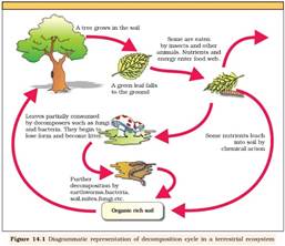 Decomposition is the process of breaking down of complex organic matter with the help of decomposers into smaller inorganic raw material such as CO2, H2O, and other nutrients. It constitutes of various processes: