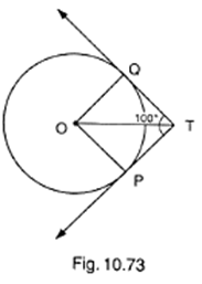 Two tangents TP and TQ are drawn from an external point T to a circle with center O as shown in Fig. 10.73. If they are inclined to each other at an angle of 100°, then what is the value of POQ?