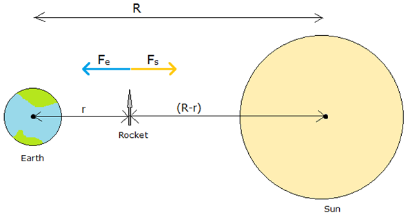 The gravitational force on Rocket due to sun Fs is equal in magnitude to attractive gravitational force by Earth Fe and opposite in direction as can be seen in the figure