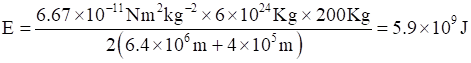 A satellite orbits the earth at a height of 400 km above the surface. How much energy must be expended to rocket the satellite out of the earth’s gravitational influence? Mass of the satellite = 200 kg; mass of the earth = 6.0 × 1024 kg; radius of the earth = 6.4 × 106 m; G = 6.67 × 10–11 N m2 kg–2.