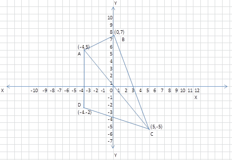 Let ABCD be the given quadrilateral with vertices A(-4,5) , B(0,7), C(5.-5) and D(-4,-2). Plotting the points on the Cartesian plane and joining AB, BC, CD, AD gives us the required quadrilateral.