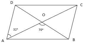 The diagonals AC and BD of a parallelogram ABCD intersect each other at the point O. If ∠DAC = 32° and ∠AOB = 70°, then ∠DBC is equal to