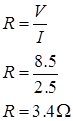 If we look at the graph, we find that when potential difference V is 8.5 volts, then the corresponding current value is 2.5 amperes. Now, Resistance,