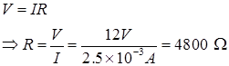 When a 12 V battery is connected across an unknown resistor, there is a current of 2.5 mA in the circuit. Find the value of the resistance of the resistor.