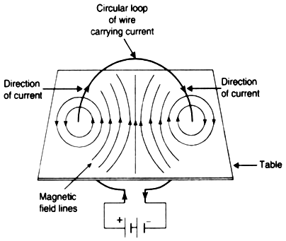 Now, by applying right-hand thumb rule to the left side of circular loop, we find that the direction of magnetic field around it is anticlockwise but the magnetic field is perpendicular to the plane of table. And by applying right-hand thumb rule to the right side of circular loop, we find that the direction of magnetic field around it is clockwise but again, the magnetic field is perpendicular to the plane of table.
