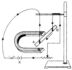 A small aluminium rod AB is suspended horizontally from a stand by the ends of two connecting wires as shown in the Figure given here. A horseshoe magnet is placed in such a way that north pole of the magnet is vertically below and its south pole vertically above the aluminium rod. The aluminium rod is connected in series with a battery, a key and a rheostat. How do you think the displacement of rod AB will be affected if: