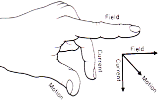 Hold the forefinger, the center finger and the thumb of your left hand at right angles to one another as shown in figure above. Adjust your hand in such a way that the forefinger points in the direction of magnetic fields and the center finger points in the direction of current, then the direction in which thumb points, gives the direction of force acting on the conductor.