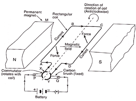 When a rectangular coil is placed in a magnetic field and current is passed through it, forces acts on the coil which rotates it continuously. When the coil rotates, the shaft attached to it also rotates. In this way the electrical energy supplied to the motor is converted into the mechanical energy of rotation.