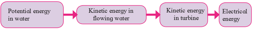 In hydroelectric power plant, the potential energy in water stored in dam is converted into kinetic energy of water. Fast flowing is brought from the dam to the turbine at the bottom of the dam. The kinetic energy of the flowing water drives the turbine. The turbine in turn drives the generator to generate electricity. The step- by - step transformation of energy is shown in the diagram below: