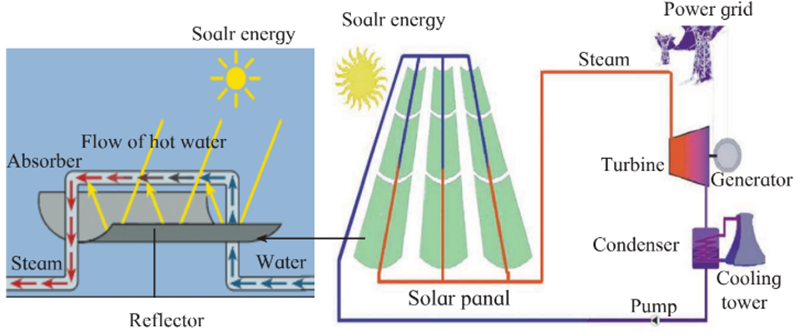 2. Absorber absorbs all the concentrated sunlight. Here the solar energy is converted into heat energy. Using this heat energy steam is generated to drive the turbine and generator.