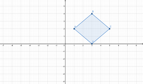 Locate the points A(1,2), B(3,4) and C(5,2) on a graph sheet taking suitable axes. Write the coordinates of the fourth point D to complete the rhombus ABCD. Measure the diagonals of this rhombus and find whether they are equal or not.