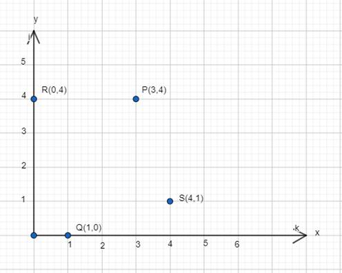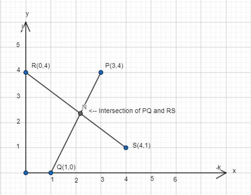 Locate the points P (3, 4), Q (1, 0), R (0, 4), S (4, 1) on a graph sheet and write the coordinates of the point of intersection of line segments PQ and RS.
