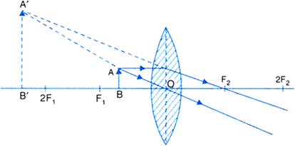 When the object is placed between F2 (in fig marked as F1) and optic centre then the rays coming from the object parallel to the principal axis after refraction will pass through focus. The ray passing through optic centre O will pass without deviation. The two refracted rays will never meet in real so the rays are extended backwards to get a virtual image. The image is formed beyond 2F behind the object and is virtual, magnified & erect.