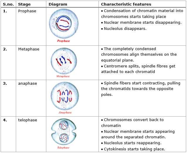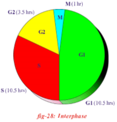 b) M-phase: It is the phase of cell division or mitosis and consists of 2 stages- karyokinesis (nuclear division) and cytokinesis (cytoplasmic division). Karyokinesis is further divided into 4 stages namely- prophase, metaphase, anaphase, and telophase.