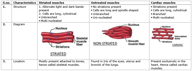 Differentiate between striated, untreated and cardiac muscles on the basis of their structure and site / location in the body. (AS1)