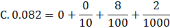 On comparing the whole part we get that 0 is the smallest. On comparing the tenth part of those whose whole part is 0. We get,0.082 has the smallest tenth part i.e. 0. Thus 0.082 is the smallest.